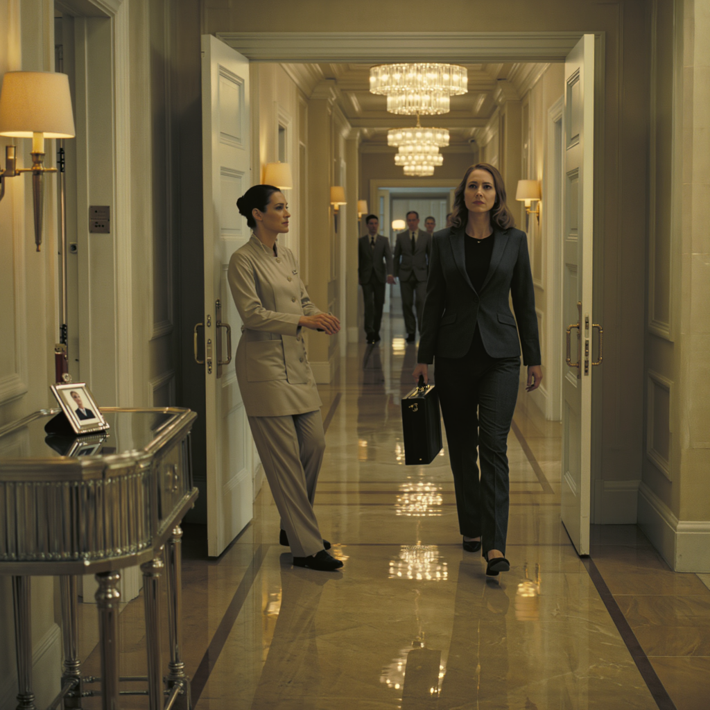 On the morning of the engagement, I dressed in the dark jacket I’d chosen weeks earlier—calm, non-descript, a face that wouldn’t draw attention. Zuri and the lawyer met me on the sidewalk outside the hotel. We walked in together, a small, ordinary trio. The employee handed me a staff ID and led me through a service entrance, past the gleam of chandeliers and a corridor of mirrored walls.