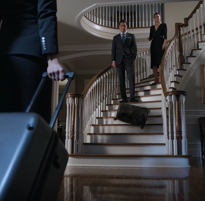 The suitcase down the stairs.