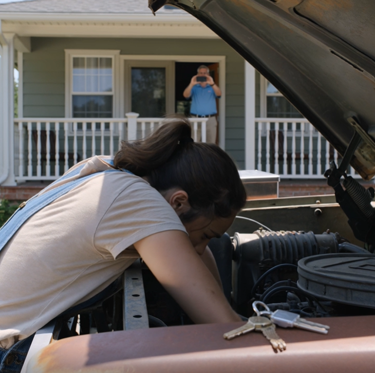 A video of me bent over the engine, ponytail hanging down, shirt plastered to my back, arms covered in grease, wiping sweat off my face with the back of my hand.
